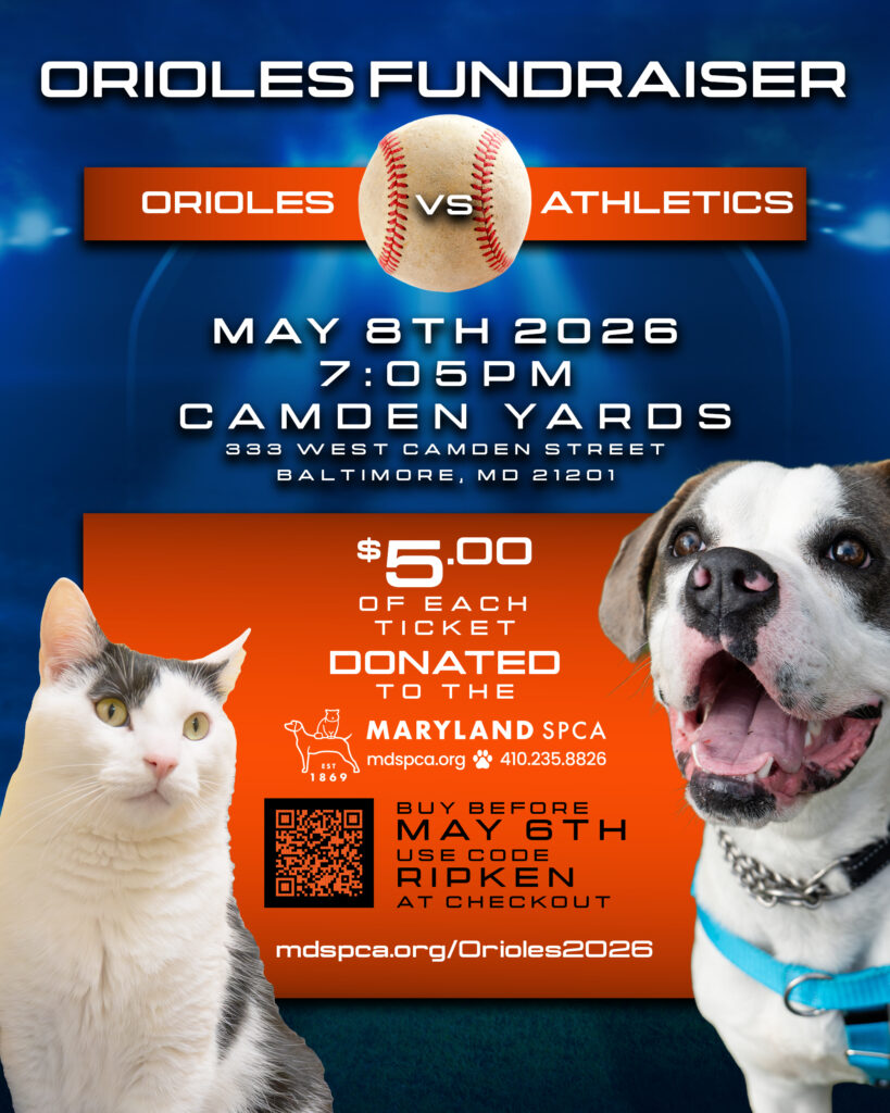 Please join us for our Orioles fundraiser event. Watch the Orioles take on the Athletics at 7:05pm. $5 from every ticket benefits the Mayland SPCA!! The giveaway that evening is a Tupac Shakur bobblehead. Purchase Deadline: May 06, 2026 7:05 PM EDT