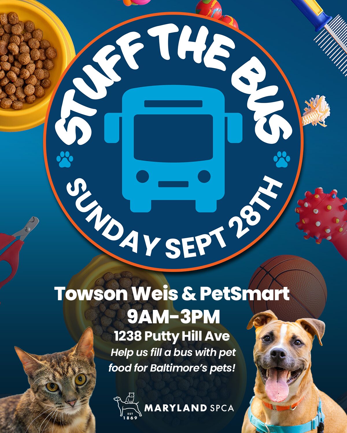 Join us to at our Stuff the Bus event on September 28th, 9AM-3PM at the Towson Weis and help us fill a bus with pet food for Baltimore’s pets!